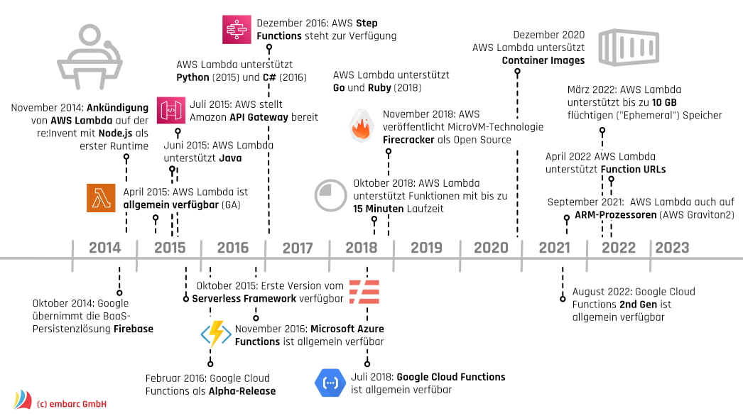 AWS Lambda stellte vor einem Jahrzehnt einen Meilenstein im Serverless-Trend dar. Aber auch die Marktbegleiter schlafen nicht. Google Cloud Functions beispielsweise hat 2022 ein größeres Update erfahren („2nd Gen“, [Ram+2022]). Anders als mitunter erwartet blieb der ganz große Hype, verglichen etwa mit Docker und Kubernetes, bisher aus. Woran liegt das? M. Roberts et al. [Rob+2017] diskutieren Serverless (im Sinne von BaaS + FaaS) als eine andere Art Anwendungen zu bauen. Sie erfordere neue Entwurfskonzepte, Werkzeuge und Betriebsmodelle. Bestehende Anwendungen lassen sich nur schwierig sinnvoll dahin befördern und anpassen.