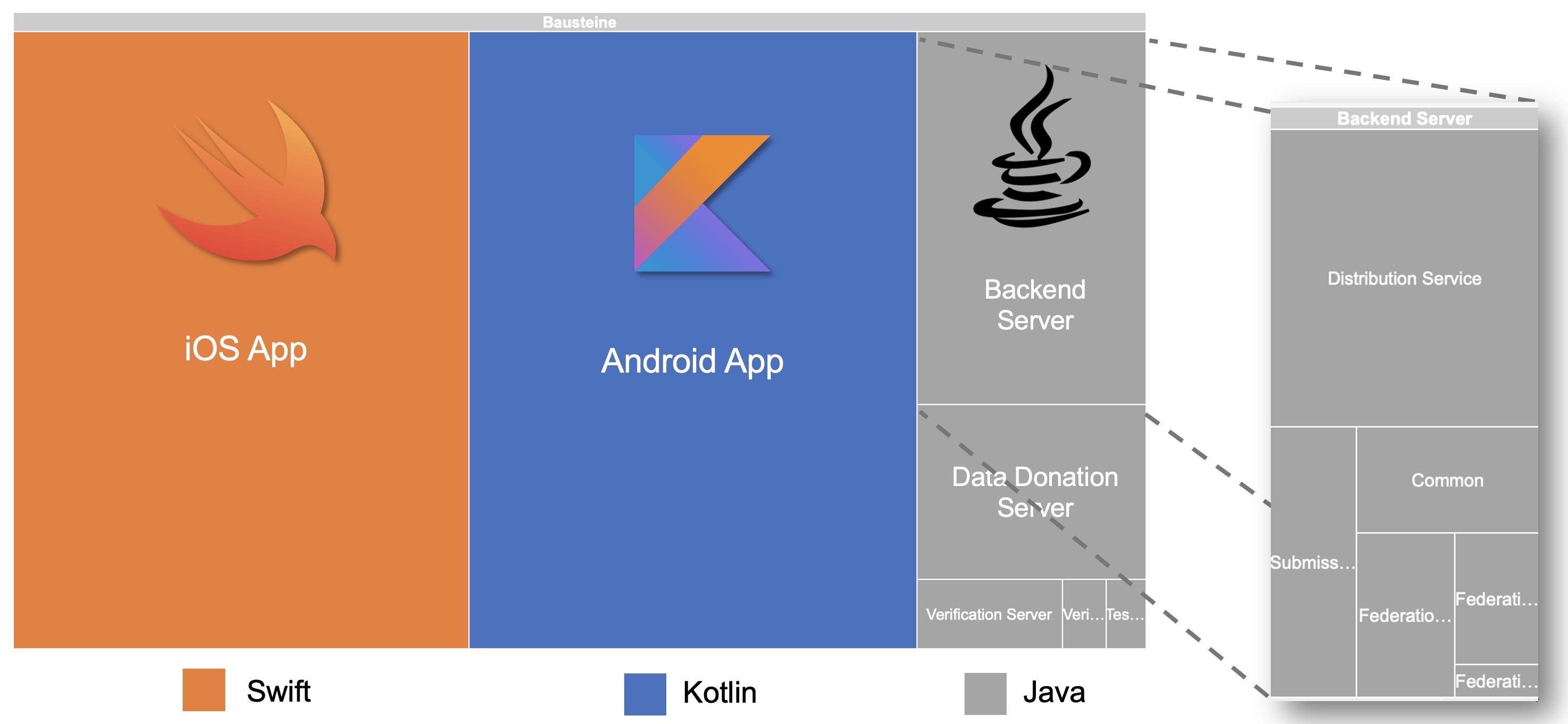 Auf dem öffentlich verfügbarem Quellcode kann man sehr gut verschiedenste Metriken berechnen lassen. Auf der folgenden Treemap entspricht die Fläche der Kacheln der Anzahl der Codezeilen des jeweiligen Repositories und die Farbe verweist auf die Programmiersprache. Interessant ist, dass die Backend-Komponenten im Vergleich zu den Apps deutlich kleiner sind.