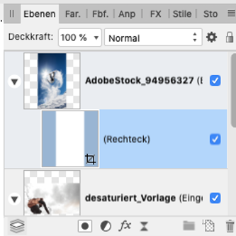 Wenn ihr mit Affinity beispielsweise eine Collage von Bildern erstellen möchtet, sind zwei Funktionen äußerst praktisch. Zum einen nutzen wir die Funktion Bilder direkt im Dokument zu „zerschneiden“. Als Ausgangspunkt habt ihr bereits mehrere Bilder in einem Dokument platziert. Wählt ihr nun das Zuschneiden-Werkzeug aus, könnt ihr lediglich das ganze Dokument und somit auch das Format dieses Dokuments verändern bzw. zerschneiden. Dies ist beim Bearbeiten von Collagen aber in der Regel nicht des Rätsels Lösung. Zum Auswählen bestimmter Bildausschnitte greift ihr hingegen auf das Formen-Werkzeug zurück, also zum Beispiel das Rechteck. Hiermit wählt ihr direkt auf dem Bild den gewünschten Bildausschnitt aus und zieht die entstandene Ebene rechts neben die Ebene des Bildes. So habt ihr eine Maske erstellt, durch welche eben nur der bestimmte Bereich des Bildes angezeigt wird.